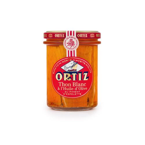 Découvrez le Thon Blanc Germon à l'huile d'olive au Piment d'Espelette dans son élégant bocal en verre, une création authentique signée Ortiz. L'alliance parfaite entre la finesse du meilleur thon blanc germon et la douceur de l'huile d'olive est sublimée par une touche de piquant venue tout droit du Pays Basque. Ce produit original incarne l'essence même de la gastronomie basque, offrant un mariage exquis entre la chair onctueuse du thon blanc germon et l'intensité envoûtante du Piment d'Espelette. Parfait pour égayer vos salades ou sublimer vos plats de pâtes, chaque dégustation est une invitation à un voyage gustatif incomparable. Laissez-vous séduire par ce mariage de saveurs inédit et laissez-vous emporter par l'authenticité des traditions culinaires basques. Ingrédients : Thon Blanc Germon (Thunus alalunga) (68%), huile d’olive (31%), sel (0,5%), piment d’Espelette (0.5%) | Valeurs nutritionnelles (pour 100g) : | | Énergie | 168 kcal | | Matières grasses | 6.7 g | | Acides gras saturés | g | | Glucides | g | | dont sucres | g | | Protéines | g | | Sel | g | Contenance : 220 g Origine : Espagne |